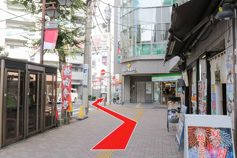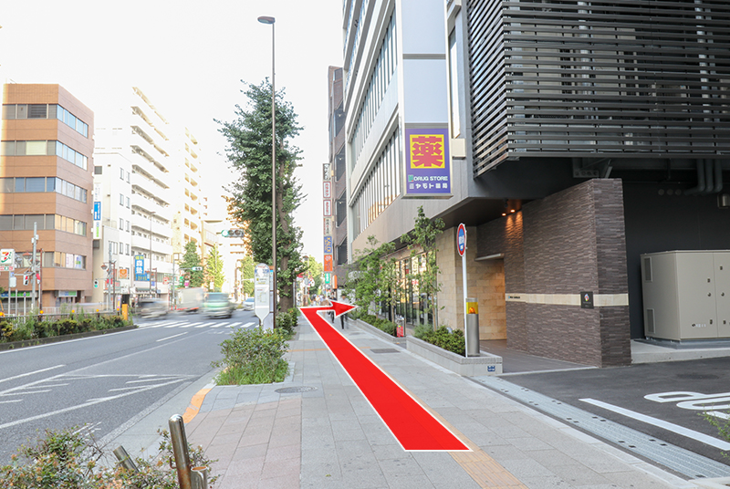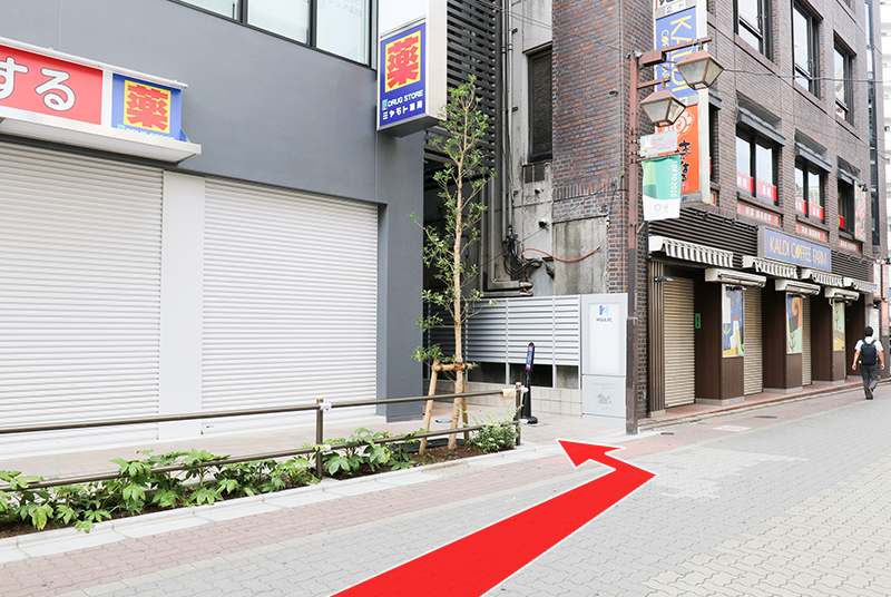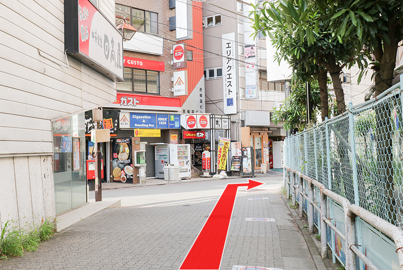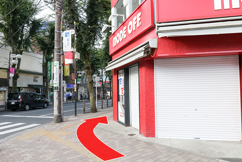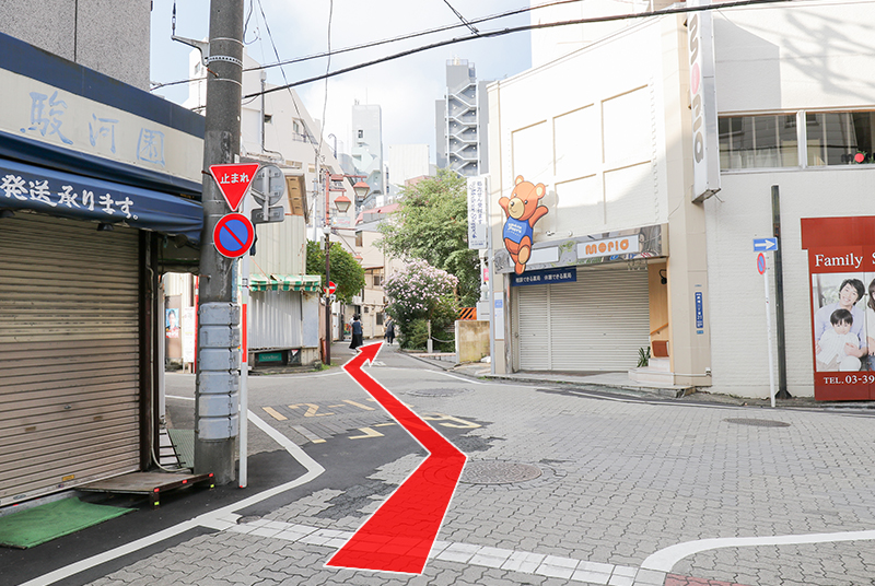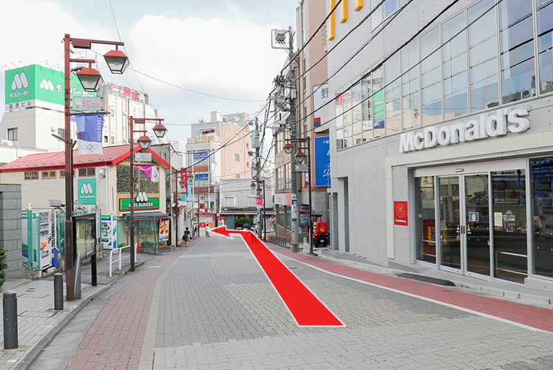 坂を下り、マクドナルドとモスバーガーを過ぎた先の突き当たりを左に曲がって直進してください