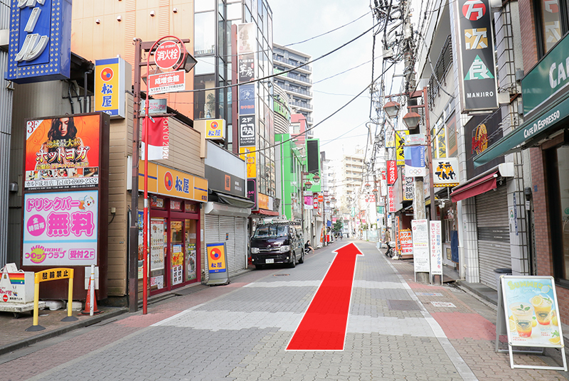 松屋、てんや、万次郎が見えてきたらあと少しですので、もう少し直進してください
